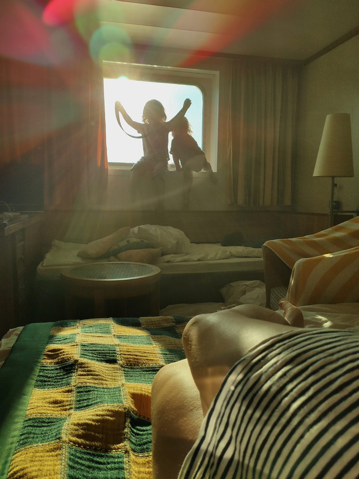 … suchen wir nochmal auf, bevor es zum Abendessen geht. Unser Gepäck wartet schon auf uns und so können wir uns auch noch fix frisch machen. Wir haben eine Familienkabine, mit fast 16qm nicht riesig, aber ausreichend groß. Andere Schiffe der A-ROSA Flotte verfügen über Kabinen mit Verbindungstür oder sogar mit vier Betten, für uns ist unsere Kabine aber genau richtig. Wir haben ein Doppelbett, das der Kleine und ich uns teilen, mein Großer schläft in einem vollwertigen und gemütlichen Zusatzbett direkt unter unserem Fenster. Wir sind in der untersten Etage untergebracht, die Wellen der Donau sind auf Augenhöhe, wenn wir aus dem Fenster schauen. Eine fantastische Aussicht! Das Fensterbrett ist breit genug, um zwei Kinderpopos bequem unterzubringen und wird auf der Stelle zum Lieblingsplatz für die nächsten Tage erkoren. Dann ist es Zeit für…