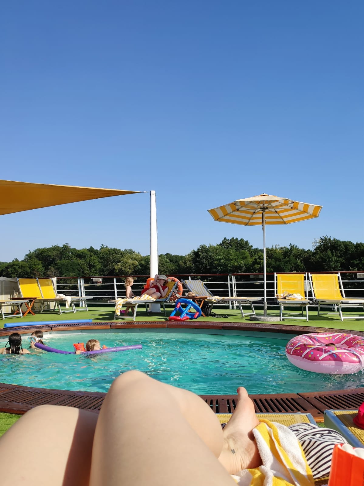 Die kleine Stadt in Österreich ist vor allem durch ihr Kloster bekannt, dass hoch oben über dem Städtchen thront. Von unserem Anlegeplatz in die Stadt geht man etwa 25 Minuten zu Fuß. Da es heiß ist und Mittagszeit, beschließen wir, diesen Stop auszulassen und nicht mehr von Bord zu gehen. Stattdessen genießen wir das leere Sonnendeck, dösen (zumindest einer von uns) und spielen im und am Pool (die anderen beiden). Am Nachmittag legen wir zum letzten Mal ab und machen uns auf den Weg nach Engelhartszell, wo unsere Reise enden wird.