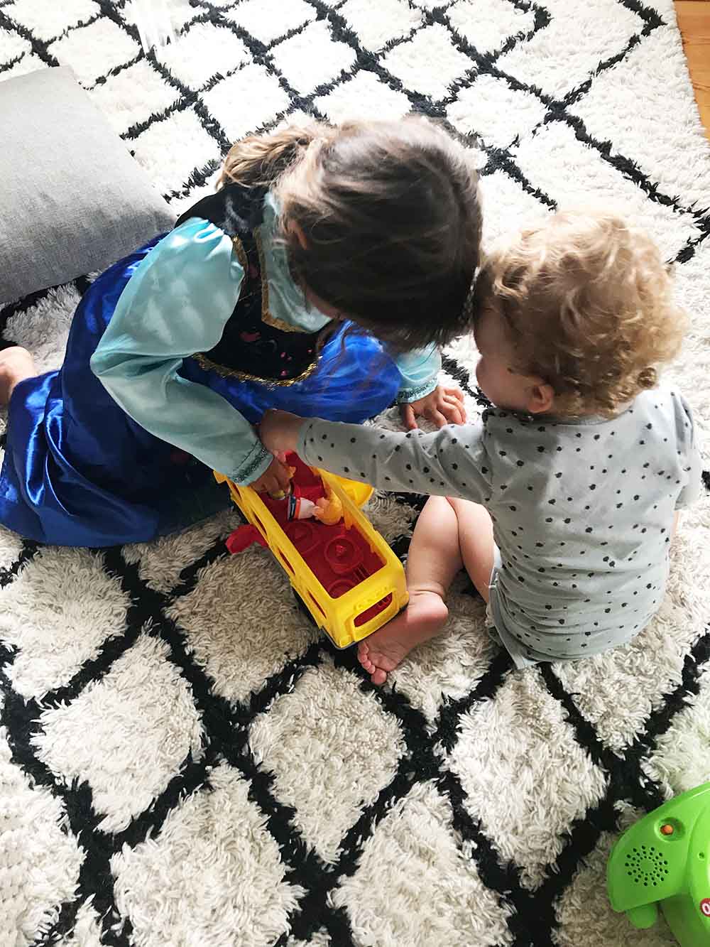 Was ich für mich und meine Kinder versuche ist, sie möglichst viel gemeinsam spielen zu lassen – ich denke davon haben beide etwas. Oskar kann natürlich wahnsinnig viel von seiner großen Schwester lernen, beobachtet sie auch immer ganz genau und schaut zu ihr auf. Doch auch Helene lernt sehr viel im Spiel mit ihrem kleinen Bruder. Sie zeigt ihm viele Dinge, erklärt sie, nimmt sich Zeit und muss sich in Geduld üben. Sie freut sich, dass sie diejenige ist, die Dinge schon kann und gackert wie eine Verrückte, wenn es Oskar noch nicht so hinbekommt wie sie.