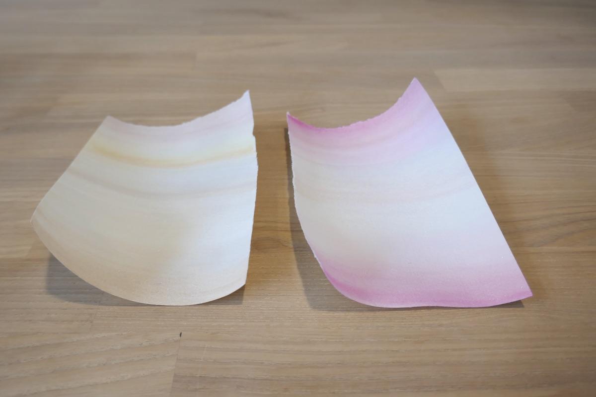 Hier habe ich oben und unten etwas Farbe aufgetragen und danach mit dem Pinsel und viel Wasser zur Mitte hin die Farbe verteilt.
