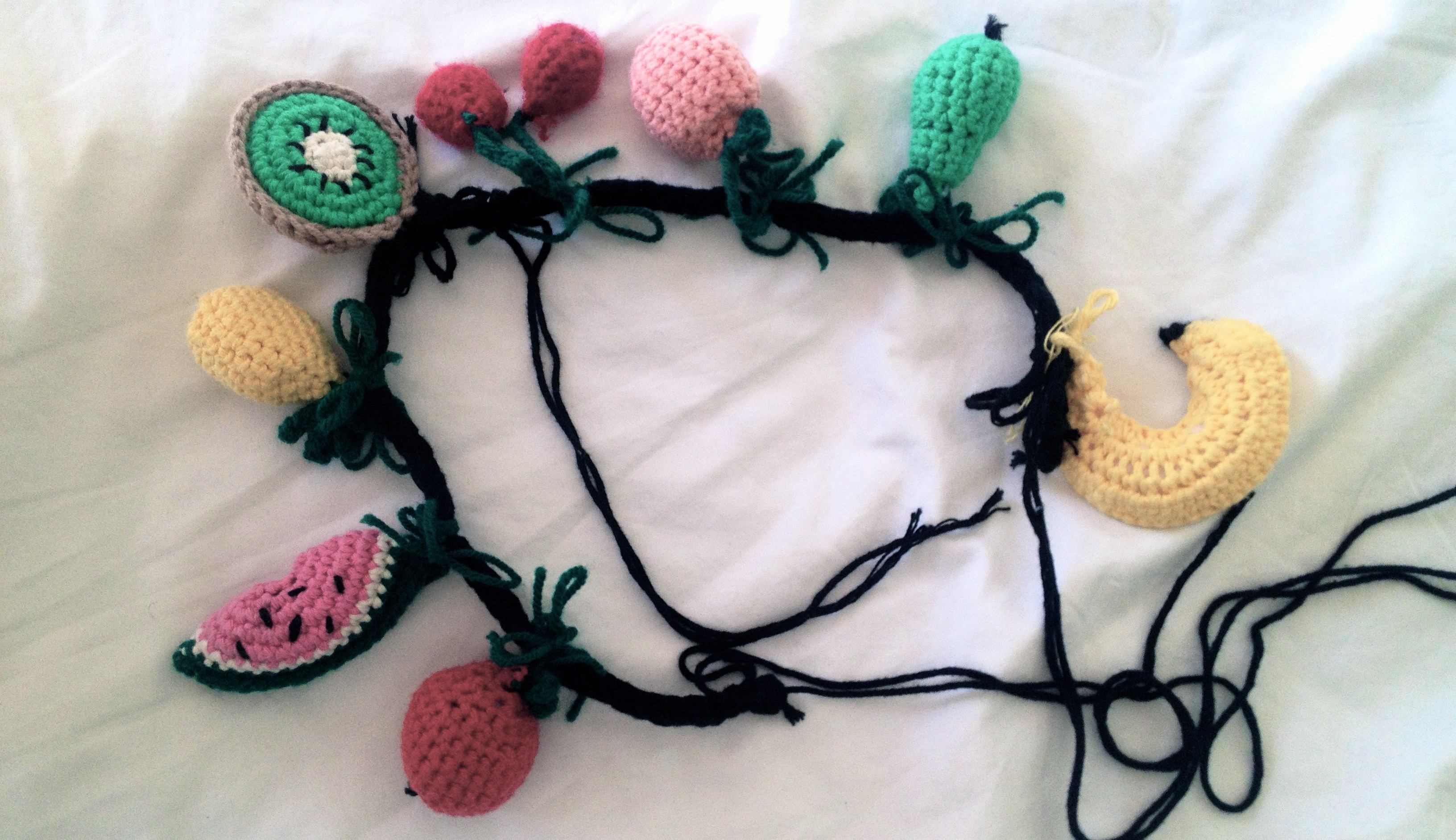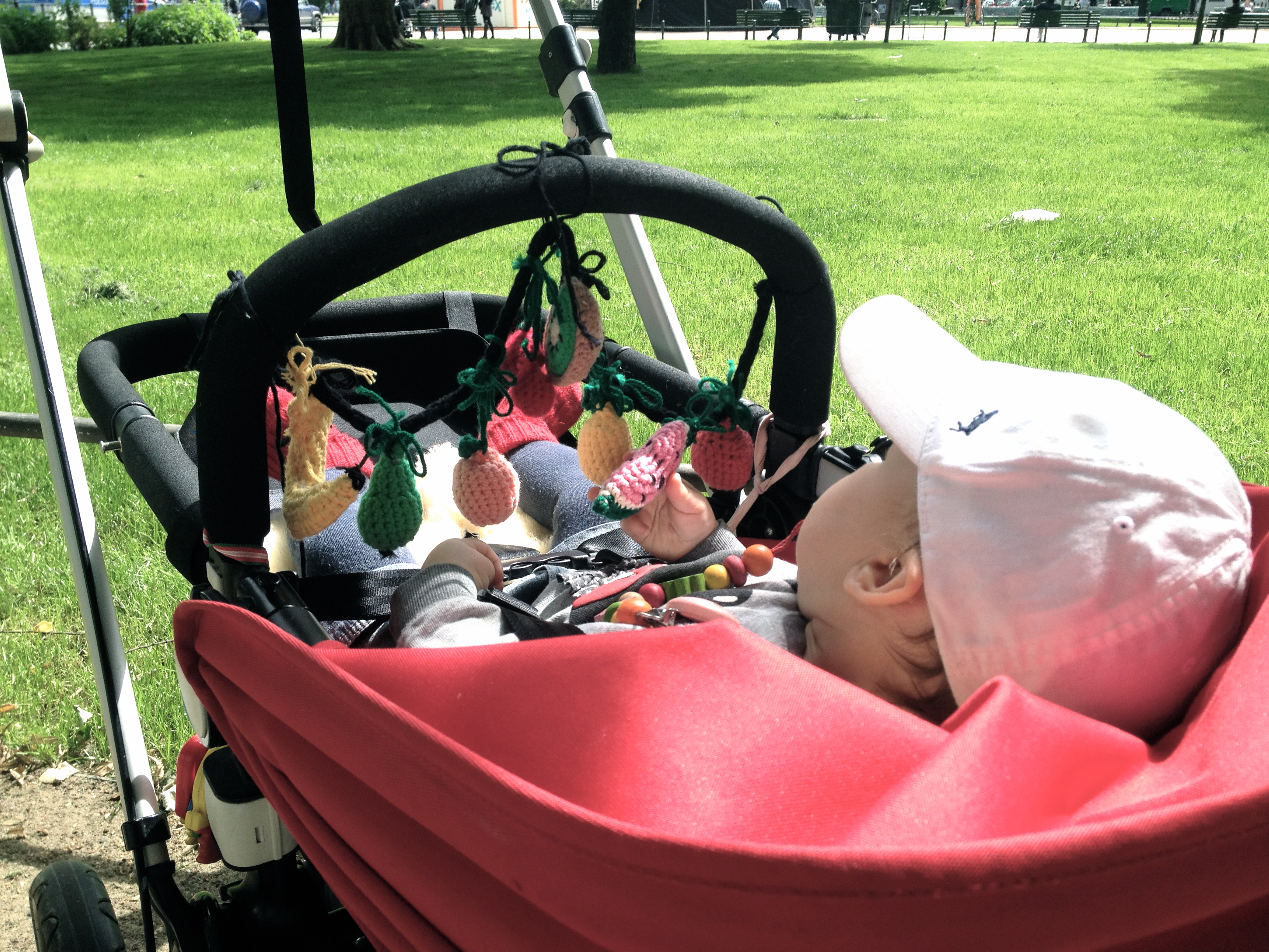 An einem unverhofften Abend mit etwas Zeit und neuer Wolle habe ich frei drauf losgehäkelt. Heraus gekommen sind verschiedene Früchte, die ich zu einer Kinderwagenkette verarbeitet habe. Rolling Obstsalat sozusagen 😀