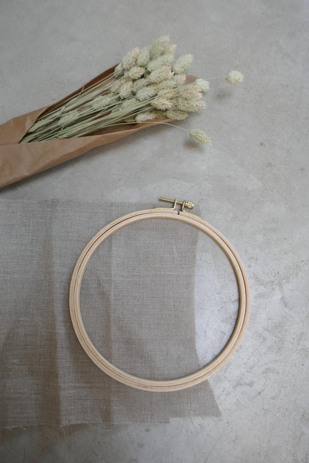 Für den ersten Step schneidet ihr euch den Stoff gut überlappend zurecht und klemmt ihn in den Holzrahmen.