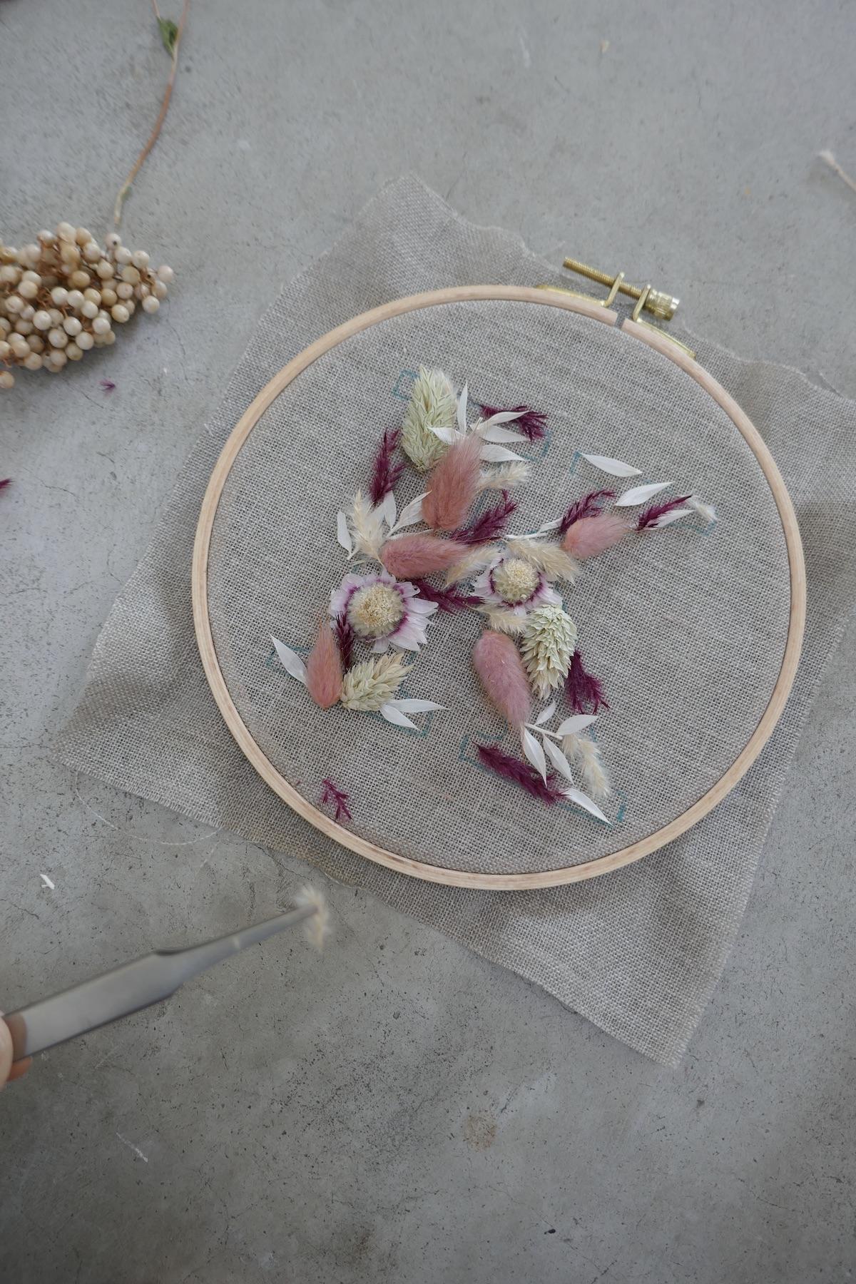 Nehmt euch den Kleber und tunkt, gerne mit einer Pinzette, die Blüten etwas in den Kleber. Drückt die Blumen einen Moment lang auf den Stoff und lasst ihn etwas antrocknen. Am Besten ihr beginnt mit den größeren Blüten und füllt am Ende die leeren Stellen mit kleinen Blättern auf.