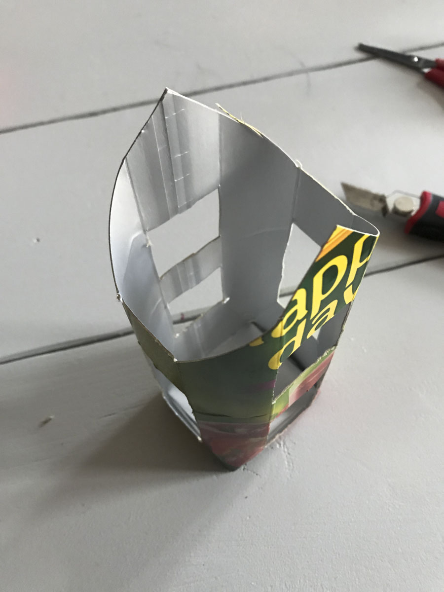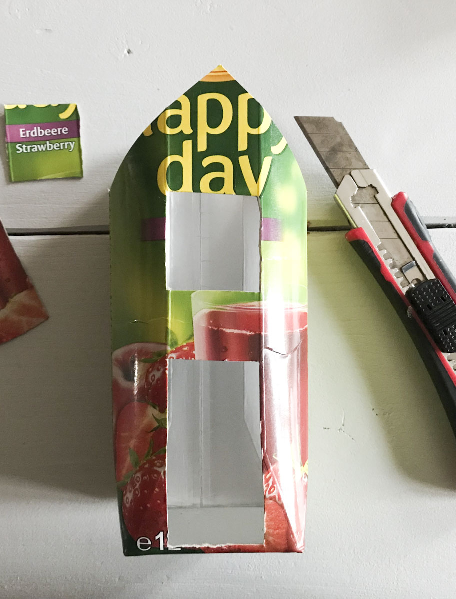 Tetrapack ausleeren, Deckel abschneiden, ausspülen und trocknen lassen!