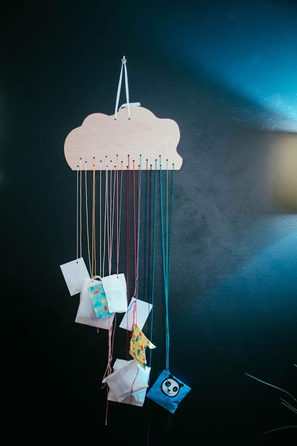Ich hab aus einem Stück Holz aus dem Baumarkt eine Wolke gesägt, 24 Löcher reingebohrt und dann Schnüre in Regenbogenfarben gehängt. Jetzt hängen wir jedes Jahr Geschenke dran. Die Anleitung findet ihr hier.
