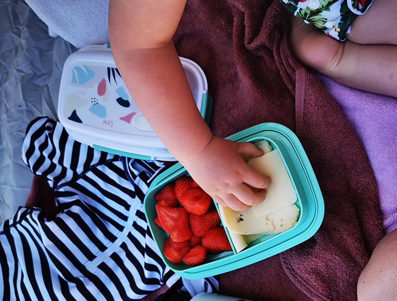Ins Gepäck gehören bei uns natürlich die Wickeltasche mit Windeln und Feuchttüchern, Sonnencreme, Handtuch, Badeanzug (für alle Fälle) und diverse Snacks und Getränke.