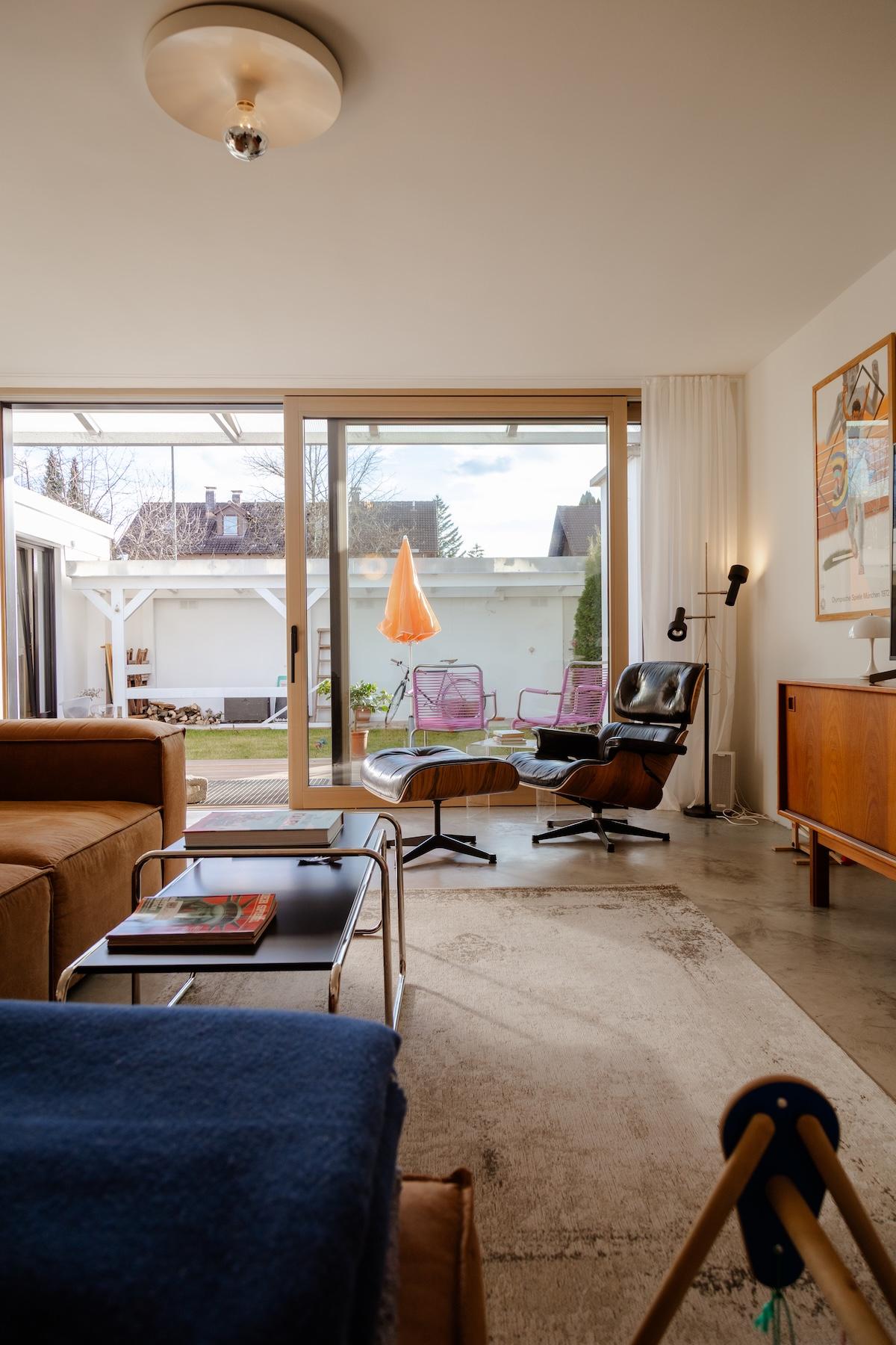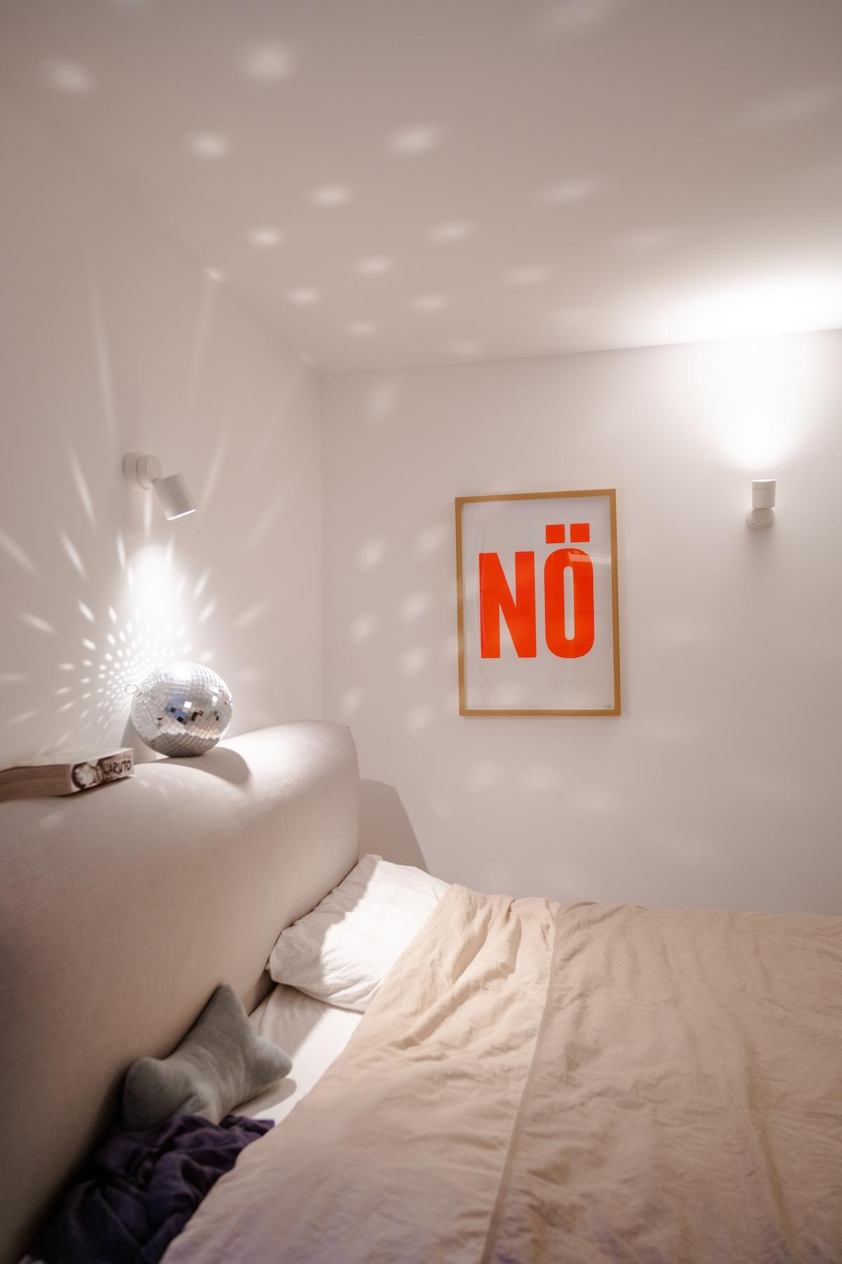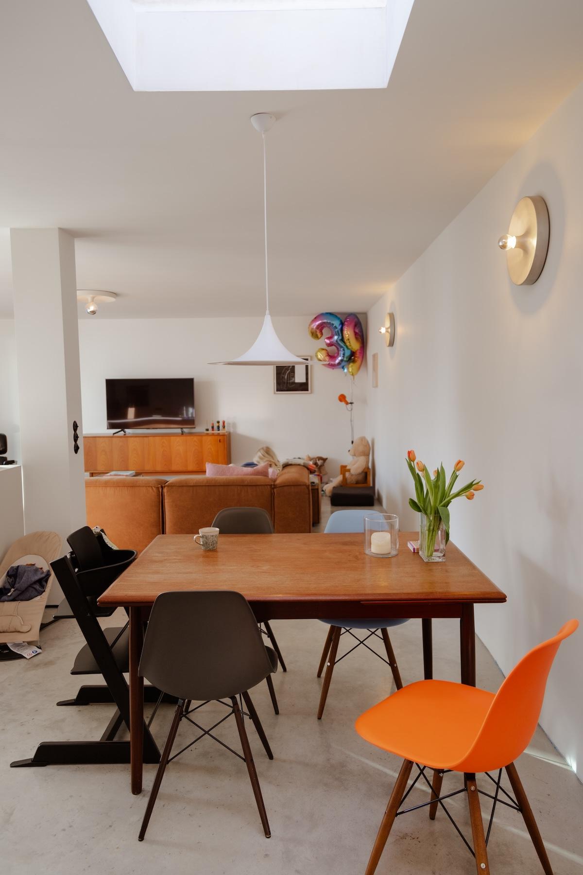 „Schon vor dem Umbau haben wir es geliebt, auf Flohmärkten und in Vintage-Shops auf Schatzsuche zu gehen. Zum Glück teilen wir beide einen sehr ähnlichen Geschmack, sodass Entscheidungen zur Einrichtung meist ganz leichtfielen. Ein Beispiel: Die Space Age Disc Lamp im Wohnzimmer – wir haben keine Sekunde gezögert, als wir sie entdeckt haben. Sie passen einfach perfekt in unser Haus.“