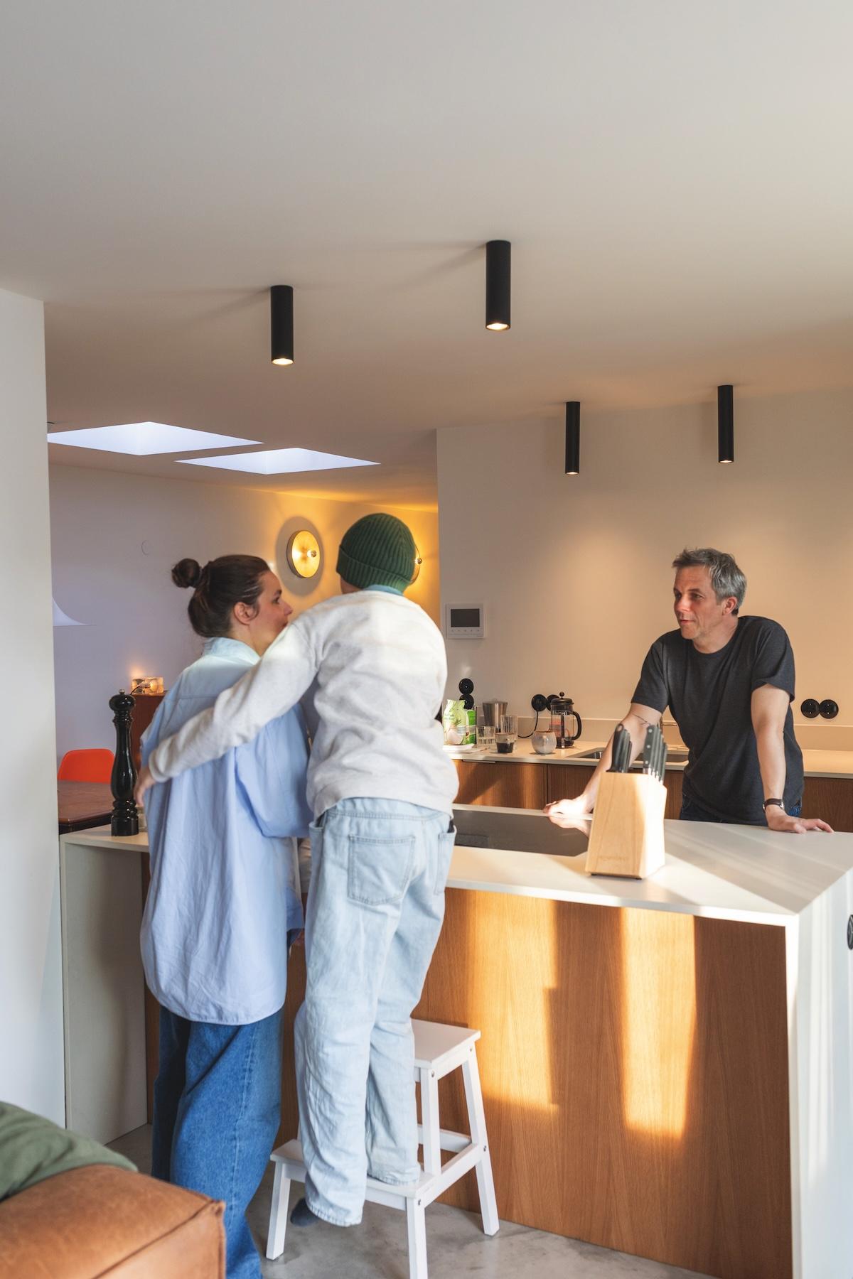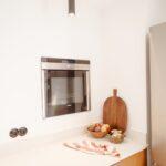 In der Küche finden sich keine klassischen Hochschränke – der Backofen sollte nicht unten eingebaut sein. So entstand die Idee, ihn in die Wand zu integrieren. Die Küche verliert keinen Stauraum und trotzdem konnten die beiden auf Hochschänke verzichten.