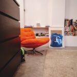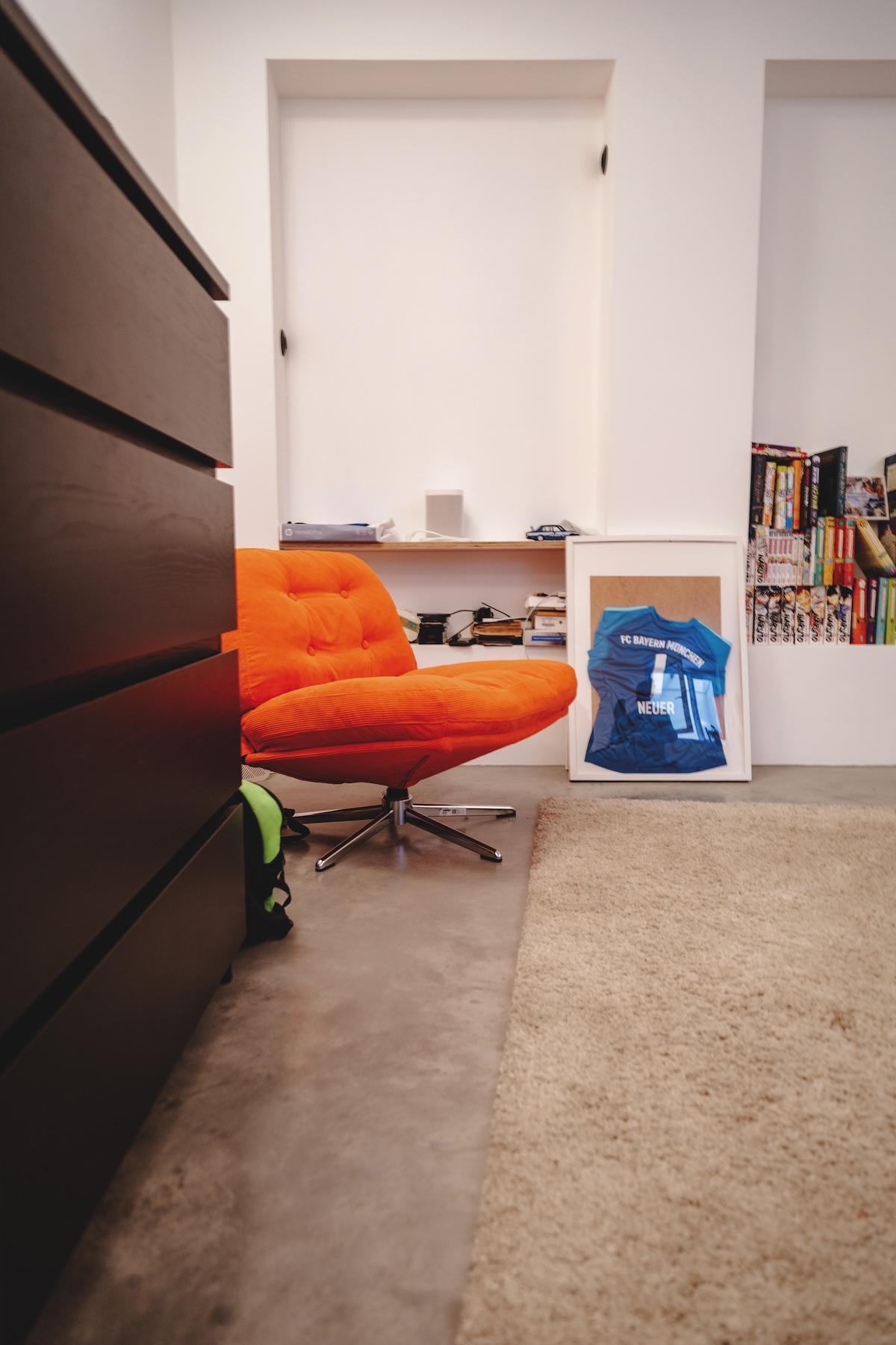 Das Highlight in Flynns Zimmer ist ein orangefarbene Drehstuhl – ein Re-Release des IKEA-Klassikers DYVLINGE. Er wurde ursprünglich in den 1960er Jahren von Gillis Lundgren entworfen und war damals unter dem Namen MILA bekannt. Lundgren war einer der ersten IKEA-Designer und unter anderem auch der kreative Kopf hinter dem BILLY-Regal.