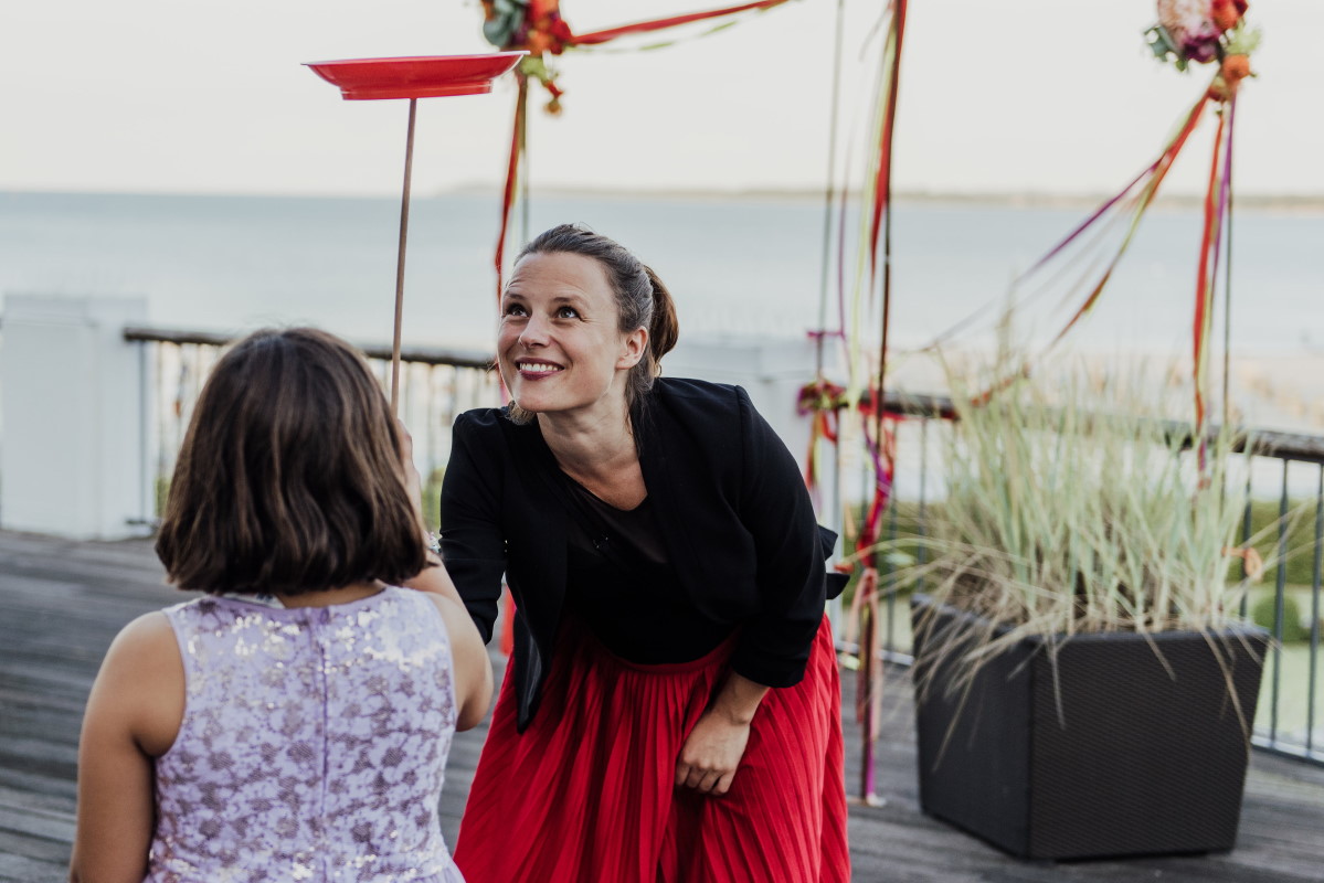 Für das Kinderprogramm überlegen wir uns Spiele, Aktionen und Basteleien, die die Kinder begeistern. In Italien haben wir Aktionen wie zum Beispiel eine Riesenseifenblasen-Mitmachaktion und Mitmach-Circus angeboten. Wir haben vorgelesen, gebastelt und die Kinder auch nachts betreut, während die Gäste in Ruhe feierten.