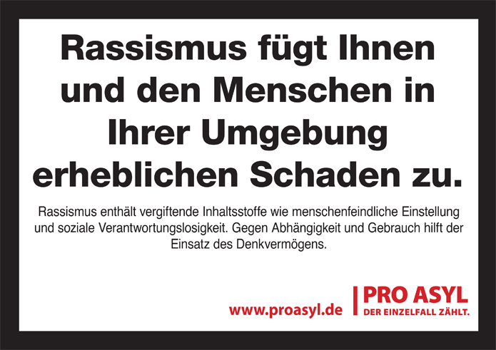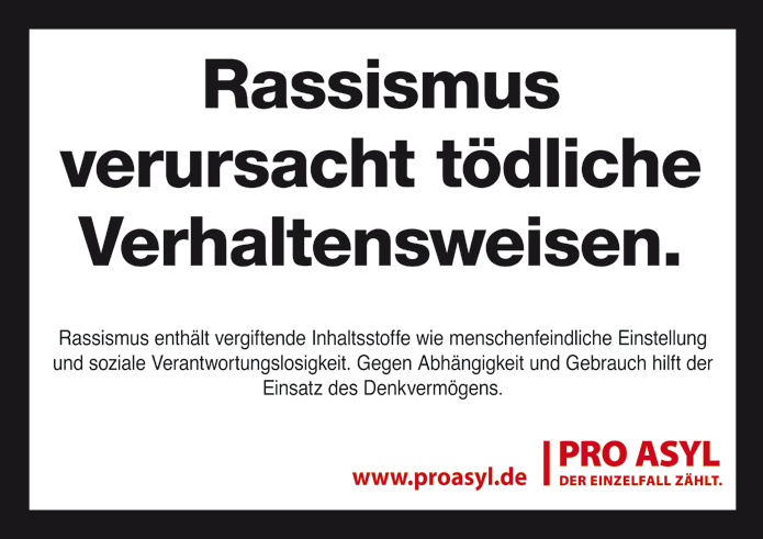 In der aktuellen Kampagne von PRO ASYL „Gemeinsam gegen Rassismus!“, könnt ihr kostenfrei Aufkleber, Postkarten und Plakate auf der Website anfordern und in eurer Umgebung verteilen, z.B. am schwarzen Brett im Supermarkt, an Litfaßsäulen oder an Plakatwänden die ihr beim Spaziergang kreuzt (Stichwort: Masking Tape).