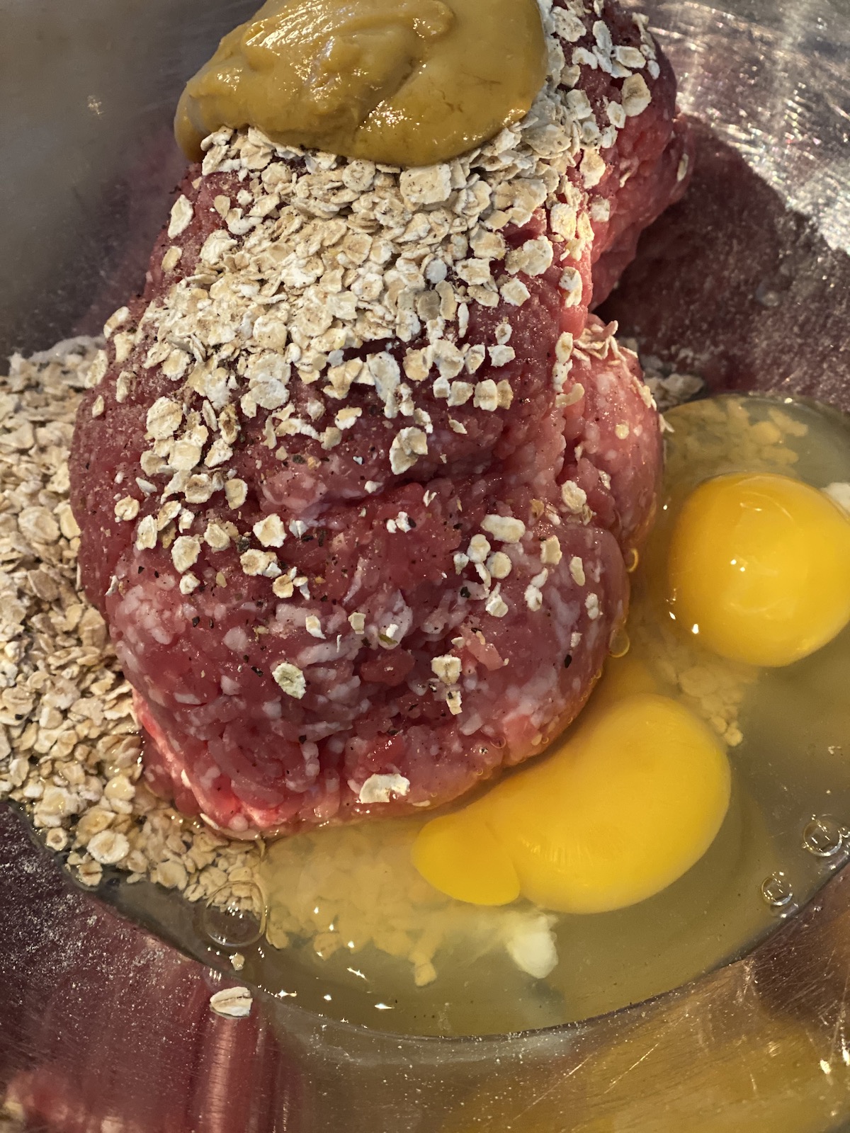 Frikadellen 600 Gramm gemischtes Hackfleisch (schmeckt auch mit Tofu) 25 Gramm Haferflocken 2 Eier Salz Pfeffer TL Honigsenf Zwiebel (optional)