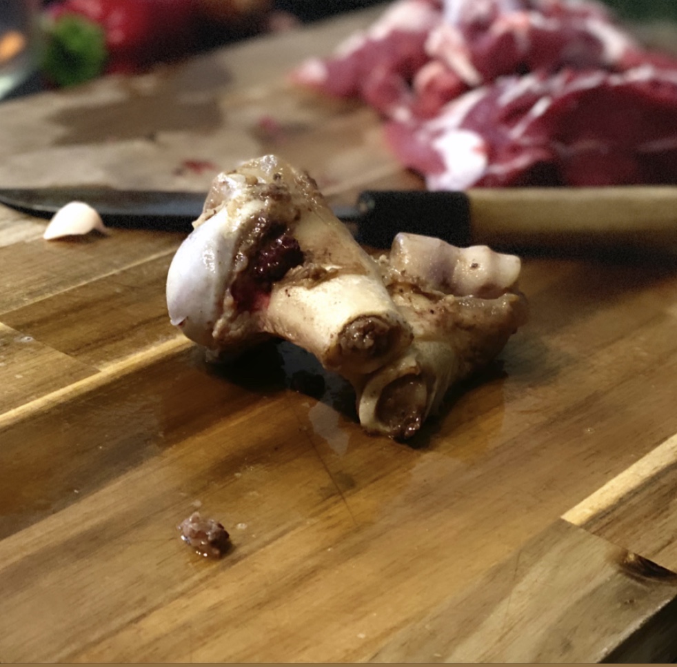 STEP 3 Der – vom Metzger ausgelöste und halbierte – Schulterknochen wird so lange für den Geschmack mitgegart, bis das Mark heraustritt. Dann solltet ihr diesen aus dem Bräter herausnehmen.