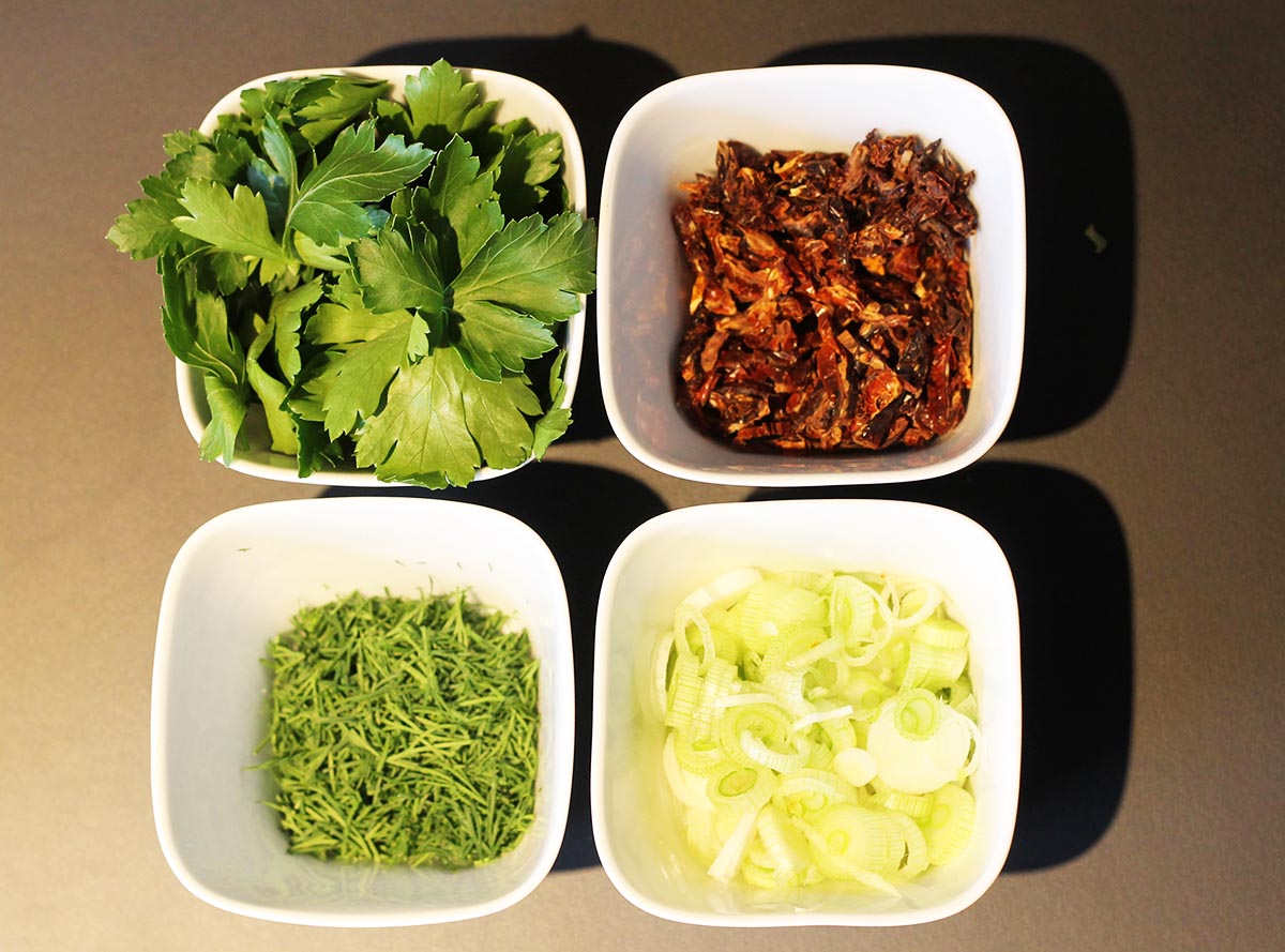 Während der Grünkern köchelt, entfach die gewünschten Gemüsesorten und Kräuter, waschen und klein schneiden und alles in eine Schüssel werfen. Ich nehme sehr gerne getrocknete Tomaten und Lauchzwiebel, denn sie geben die nötige Würze.