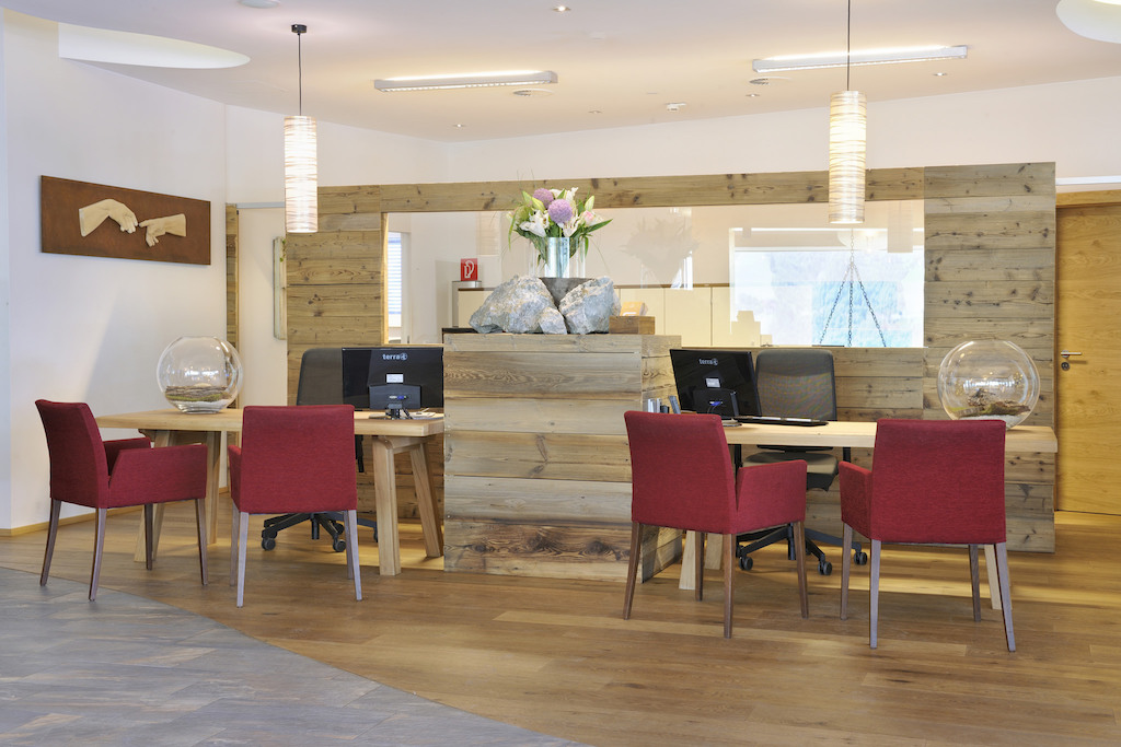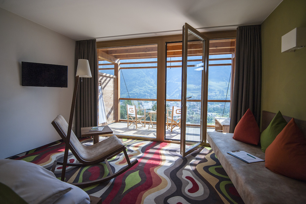 Dem Gold-Bergbau, der dem Gasteiner Tal glorreiche Zeiten bescherte, verdankt DAS.GOLDBERG seinen Namen. Doch nicht nur der Name wurde von der Umgebung geprägt, auch in der Inneneinrichtung spiegeln sich die ansässigen Rohstoffe wider. So prägt eine Kombination aus Gold, Holz, Stein, Eisen und Glas das gesamte Hotel. Einen Kontrast dazu bieten die sehr farbenfrohen Teppiche, an die ich mich erst mal gewöhnen musste. Besonders gelungen ist das romantische in Szene Setzen besonderer Möbelstücke durch eine durchwegs gedämpfte Beleuchtung. Die Zimmergrößen sind sehr variabel. Angefangen mit einem Studio in Größe S mit 26 qm bis hin zu den Suiten mit 90 qm kann man je nach Belieben und Möglichkeiten wählen. Ein absolutes Highlight auf den Zimmern ist die äußerst großzügige Terrasse mit Blick auf das gesamte Tal. Was das Hotel für mich auch noch sehr besonders macht, ist seine schöne Lage am Berg, welche einen beeindruckenden Panoramablick zulässt. Man kann auf das gesamte Gasteinertal herunterblicken und fühlt sich schwerelos.