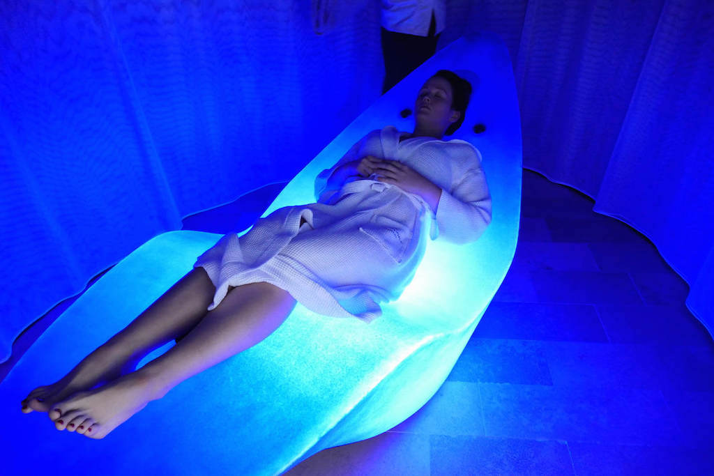 Drei verschiedenen Saunen werden im Ono Spa angeboten, die uns allbekannte finnische Sauna und eine Biosauna mit 50 Grad. Für Damen wird auch noch eine extra finnische Saune angeboten. Das Highlight des Spas sind die drei Liegen: Alpha Sphere, Iyashi Dôme und iLifeSomm. Alle drei Liegen sollen eine besondere Wirkung auf den Körper und das Bewusstsein haben. Auf der Alpha Sphere Liege wirkt ein Zusammenspiel aus Klängen, blauem Licht und Wärme so auf den Körper ein, dass ein Zustand von Ruhe und Ausgeglichenheit entsteht – klingt doch alles ganz einleuchtend. Beim Iyashi Dôme handelt es sich um eine Infrarot-Liege, die durch ihre Wärme den Körper tiefenentgiftet. Der gesamte Körper wird so sehr erhitzt, dass durch das starke Schwitzen Toxine und Schlackenstoffe ausgeschwemmt werden. Und davon haben wir Jungmamas ja viel. Ganze 600 Kalorien sollen in 30 Minuten verbrannt oder besser ausgeschwitzt werden. Die dritte und letzte Liege ist die iLifeSomm. Vibration, Klänge, Massage und die Magnet-Resonanz wirken hier gleichzeitig auf den Körper ein. Dieses Zusammenspiel soll den Körper regenerieren und dabei unterstützen Energieblockaden aufzuheben. Auf der Terrasse des Ono Spas befindet sich noch eine weitere Überraschung: der Via Sensus Fußreflexzonen Weg. Hier kann man einen 25 m langen Rundgang starten und etwas Gutes für seine Füße tun.