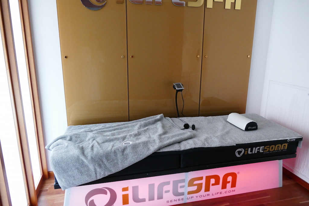 Drei verschiedenen Saunen werden im Ono Spa angeboten, die uns allbekannte finnische Sauna und eine Biosauna mit 50 Grad. Für Damen wird auch noch eine extra finnische Saune angeboten. Das Highlight des Spas sind die drei Liegen: Alpha Sphere, Iyashi Dôme und iLifeSomm. Alle drei Liegen sollen eine besondere Wirkung auf den Körper und das Bewusstsein haben. Auf der Alpha Sphere Liege wirkt ein Zusammenspiel aus Klängen, blauem Licht und Wärme so auf den Körper ein, dass ein Zustand von Ruhe und Ausgeglichenheit entsteht – klingt doch alles ganz einleuchtend. Beim Iyashi Dôme handelt es sich um eine Infrarot-Liege, die durch ihre Wärme den Körper tiefenentgiftet. Der gesamte Körper wird so sehr erhitzt, dass durch das starke Schwitzen Toxine und Schlackenstoffe ausgeschwemmt werden. Und davon haben wir Jungmamas ja viel. Ganze 600 Kalorien sollen in 30 Minuten verbrannt oder besser ausgeschwitzt werden. Die dritte und letzte Liege ist die iLifeSomm. Vibration, Klänge, Massage und die Magnet-Resonanz wirken hier gleichzeitig auf den Körper ein. Dieses Zusammenspiel soll den Körper regenerieren und dabei unterstützen Energieblockaden aufzuheben. Auf der Terrasse des Ono Spas befindet sich noch eine weitere Überraschung: der Via Sensus Fußreflexzonen Weg. Hier kann man einen 25 m langen Rundgang starten und etwas Gutes für seine Füße tun.
