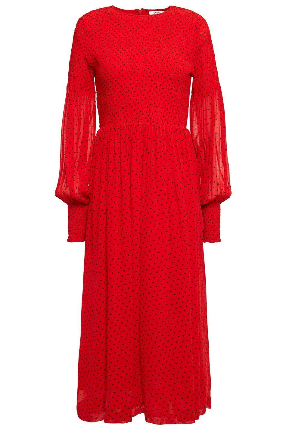 Shirred polka-dot georgette midi dress