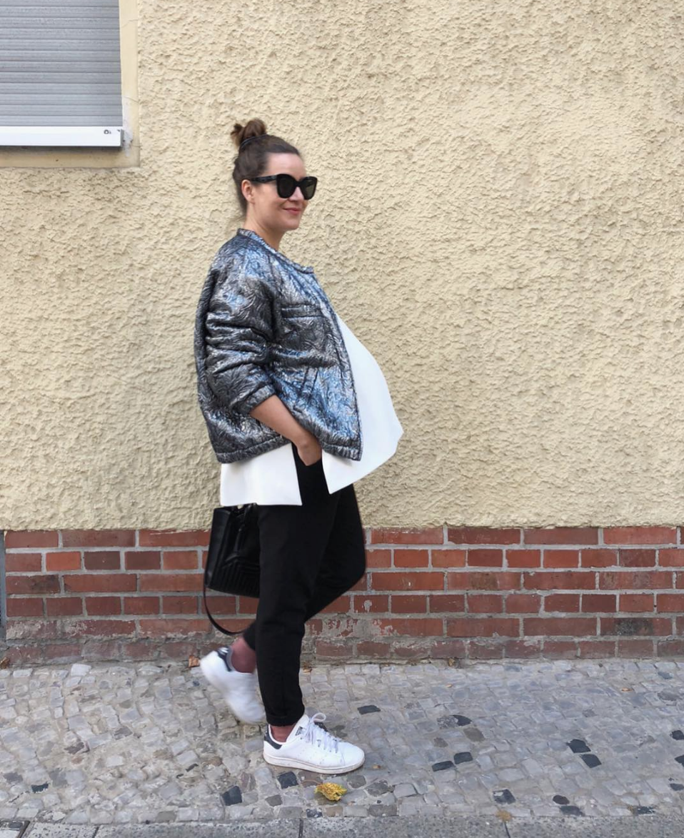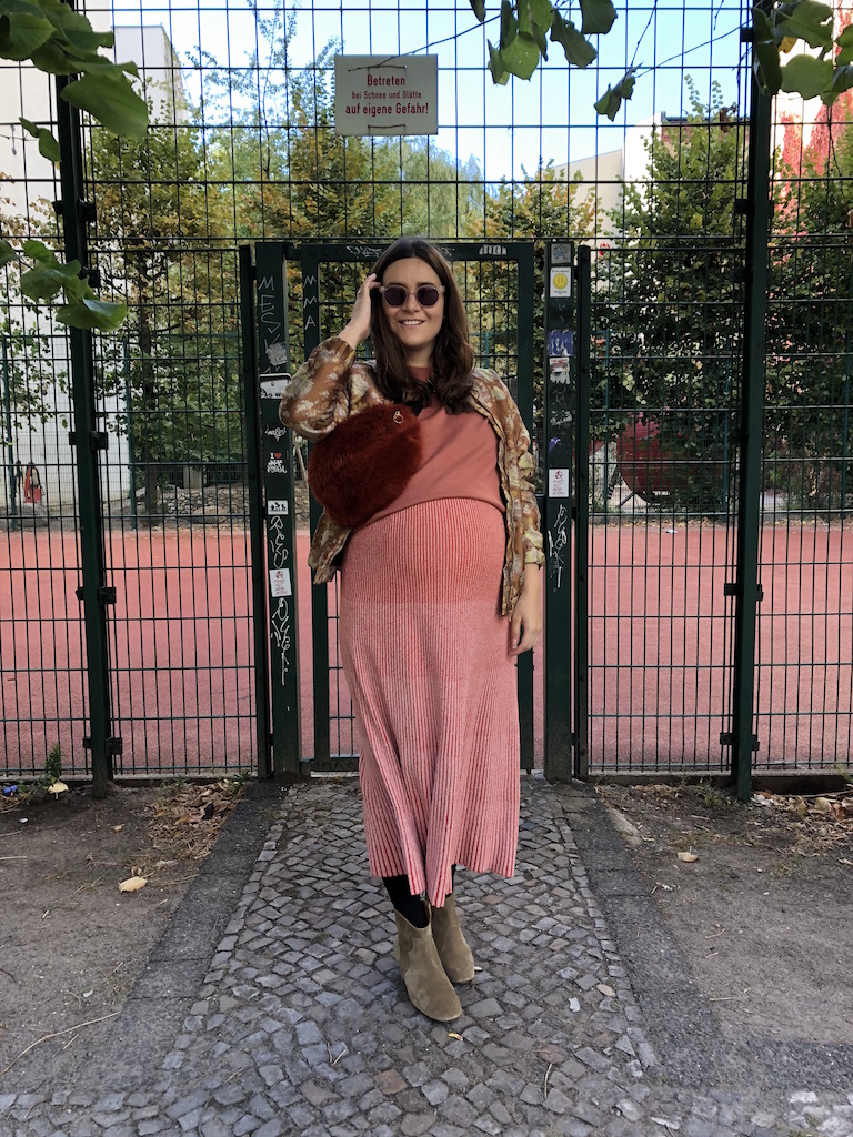 Ich trage ein Kleid und einen Pullover von COS und darüber eine glänzende Bomberjacke von H&M Trend zu Boots von Isabel Marant, eine Tasche von Baum&Pferdgarten und die einzige Schwangerschaftskleidung die ich besitze – eine Strumpfhose mit extra viel Platz für den Babybauch.