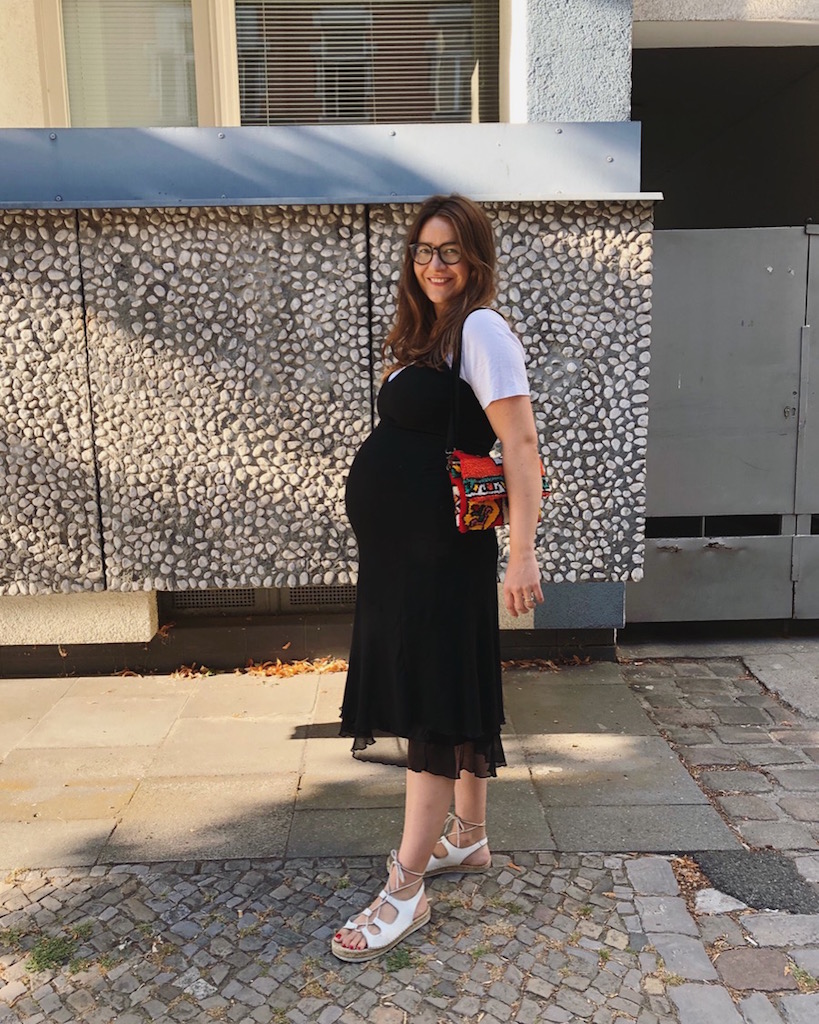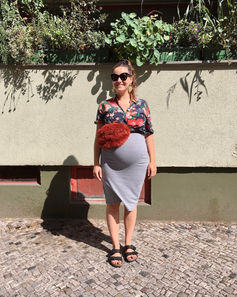 Ich liebe meine Kugel, fühle mich fit und habe glücklicherweise keine Wasserablagerungen, was die gesamte Schwangerschaft über so bleibt, aber schwer werden die Beine bei den heißen Temperaturen dann doch. In der Schwangerschaft habe ich mir mein erstes Paar Birkenstocks gekauft – jetzt weiß ich warum halb Berlin in denen rumläuft. Auf meinem täglichen Spaziergang trage ich neben den bequemen Tretern einen Rock von Monki, eine secondhand Seidenbluse, meine geliebte Puscheltasche von Baum&Pferdgarten, Sonnenbrille von Celine und Ohrringe von Mango