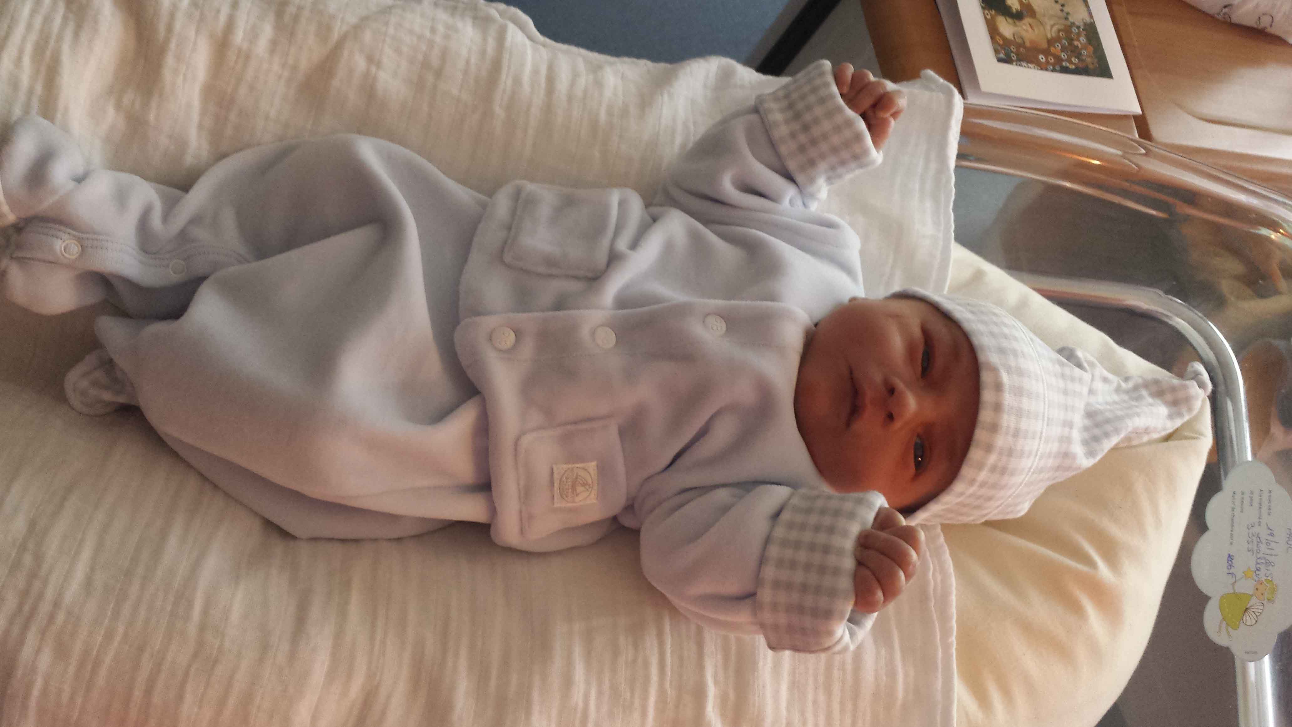 Ich stand wohl kurz vorm Kaiserschnitt, aber die Ärztin entschied, dass wir das auch so hinbekommen. Wie es dann zur Push-Phase kam, die ich als sehr kurz empfand, höchstens 10 min, hieß es dann auf einmal, dass sein Herz jetzt so müde ist, dass er beim nächsten Push draußen sein muss, sonst muss die Ärztin nachhelfen. Er war leider nicht beim nächsten Push draußen und so kam die Ärztin und nahm die Forceps (=Zangen) und so wurde unser kleiner Paul – nach 36 Stunden – Montag Abend um 19.34 Uhr mit genau 39 SS mit 3350 gr und 49,5 cm geboren. Der arme Kleine hatte von den Zangen lauter rote Striemen am Kopf. Ihm ging es aber sehr gut und nach drei Nächten im Krankenhaus fuhren wir zu dritt nach Hause.“