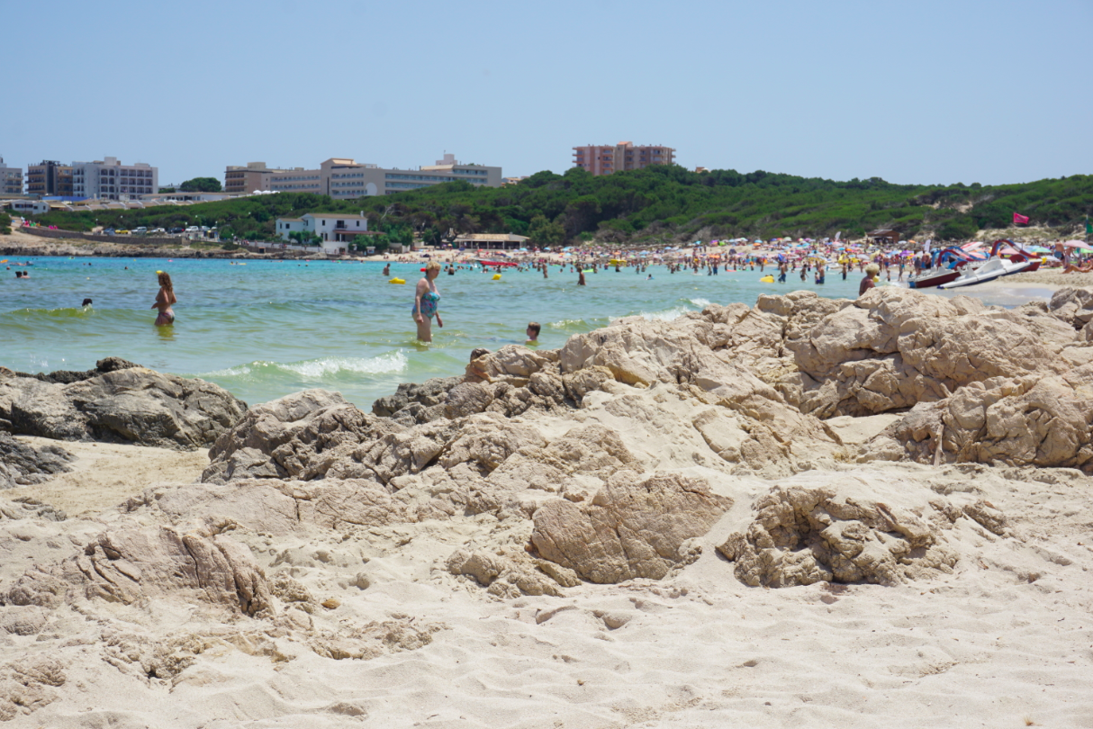 Wegen mangelnder Parkplätze haben wir aufgegeben. Eigentlich auch wegen der vielen Teenies die sich dort ihren ersten Urlaubs-Herzschmerz abholen. Die Strände sind ziemlich voll, bieten aber Liegen, Geschäfte und abends viele Bars. Einen Spielplatz gibt es dort auch, weswegen wir einmal abends mit Izzy dort waren. - Platja de Canyamel – ist ein kleiner Urlaubsort sechs Kilometer südlich von Cala Rajada mit kieseligem Sand, der auf einen Felsen geschüttet wurde. Das heißt, einen Sonnenschirm bekommt man nur mit allerlei Kreativität im Boden befestigt. Der Strand ist umgeben von größeren Hotelanlagen und deren Besucher liegen dicht an dicht auf Liegen am Wasser. Beim hineingehen ist es schnell abschüssig und tief, sodass man mit Kindern vorsichtig sein sollte.