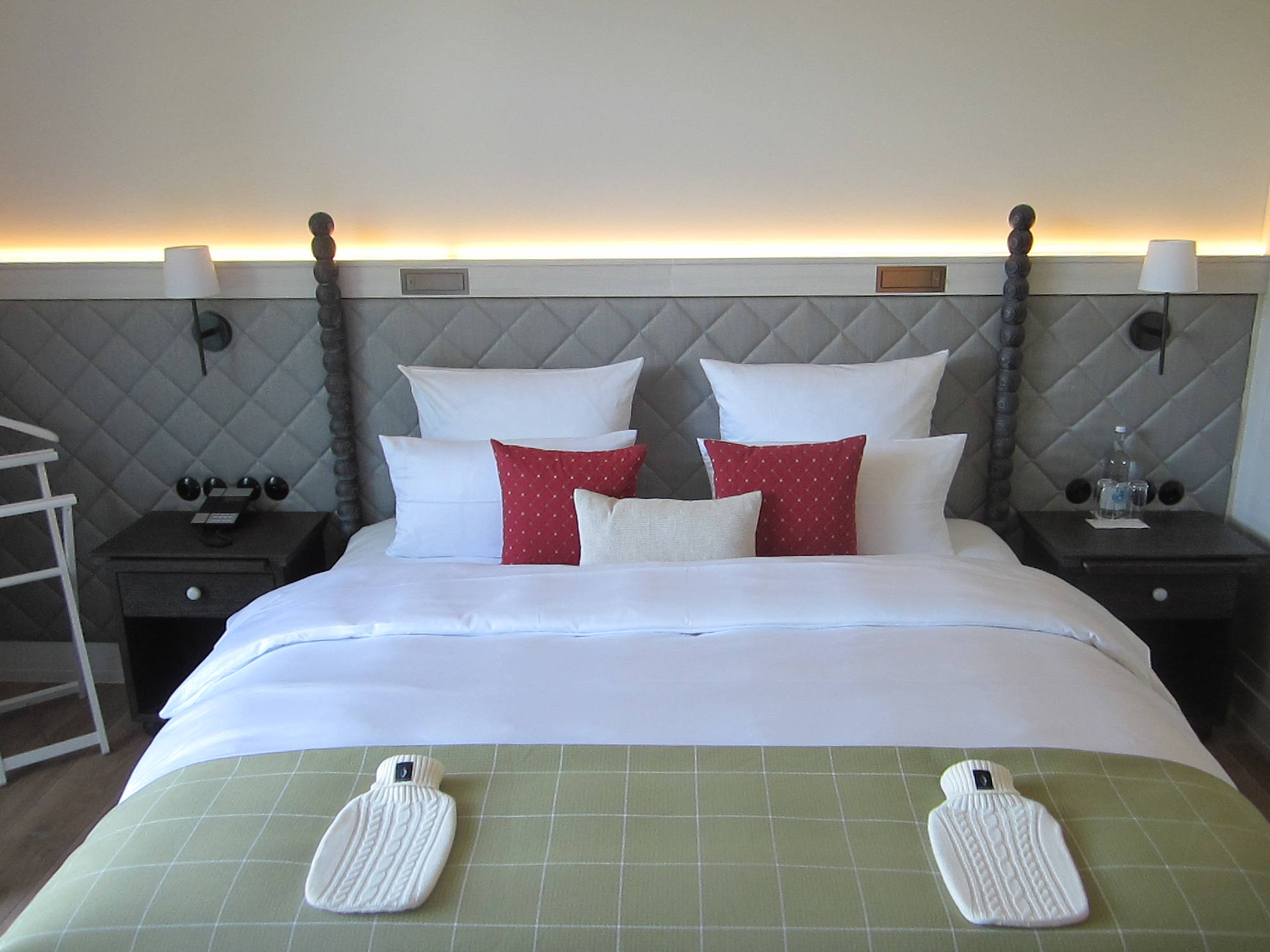 Die Hotelzimmer selber verfügen über jeglichen Komfort. Der norddeutsche Landhaus-Stil wird durch moderne Materialien und beste, gut versteckte Technik modern präsentiert. Weiß und grau dominieren. Viele Zimmer verfügen über eigene Gärten mit Knöchelhohen Kleewiesen, einem Traum für Kinder.