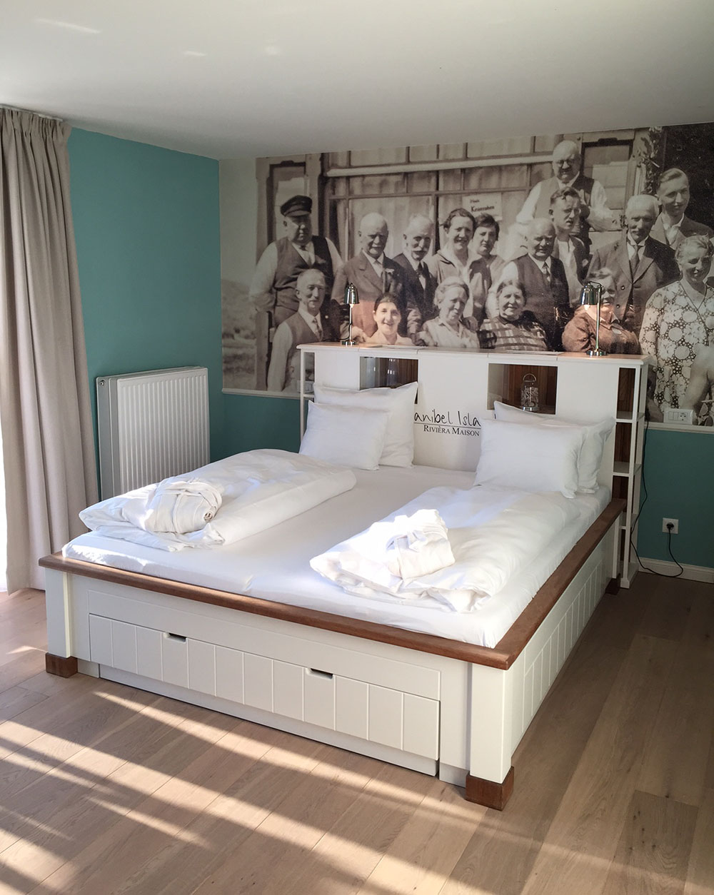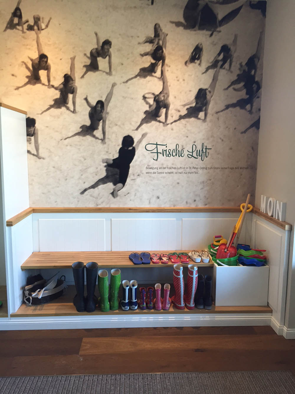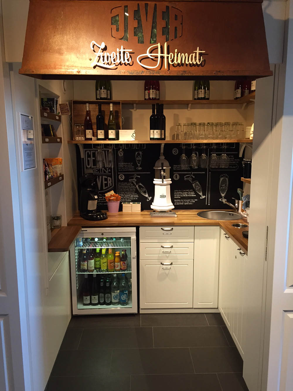 Das 2014 erbaute Hotel „Zweite Heimat“ ist unser Ziel. Direkt am Deich gelegen, einmal ne Treppe hoch und dann Meer sehen, ganz viel. Das kleine, aber sehr feine Hotel hat 47 kleine und große Zimmer, nach norddeutscher Tradition „Stuben“ genannt. Jede Stube ist sehr hübsch, liebevoll und ganz individuell eingerichtet und einem Mitglied von insgesamt sieben alteingesessenen Familien der Region gewidmet. Wir kommen unterm Dach in der Stube „Christine Feddersen“ unter. Ein echtes Highlight ist die riesige Badewanne in einer Ecke des Raumes und die gigantische Fototapete, auf der Familie Feddersen zu sehen ist. Von unserem Balkon aus können wir die Pfahlbauten am Strand und dahinter die Sonne im Meer untergehen sehen. Im Foyer gibt es eine Gummistiefel-Ausleihe für Groß und Klein. Und sollte man dank „Schiedwedder“ mal völlig durchgefroren sein, lockt das SPA „Kleine Flucht“ unter anderem mit zwei Saunen, Dampfbad, Eisbrunnen und zahlreichen Anwendungen.