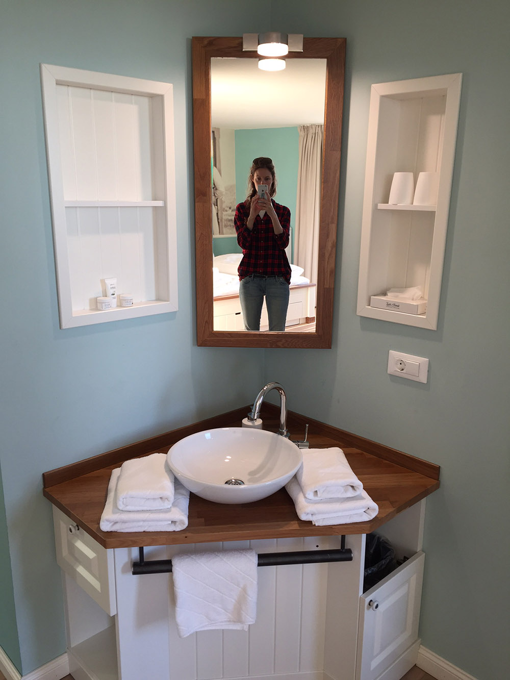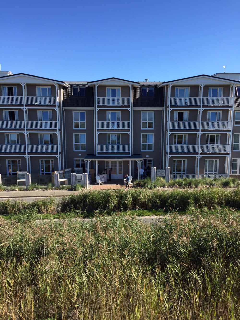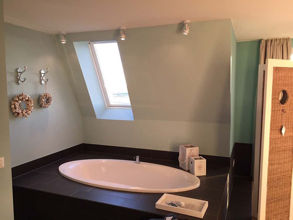 Das 2014 erbaute Hotel „Zweite Heimat“ ist unser Ziel. Direkt am Deich gelegen, einmal ne Treppe hoch und dann Meer sehen, ganz viel. Das kleine, aber sehr feine Hotel hat 47 kleine und große Zimmer, nach norddeutscher Tradition „Stuben“ genannt. Jede Stube ist sehr hübsch, liebevoll und ganz individuell eingerichtet und einem Mitglied von insgesamt sieben alteingesessenen Familien der Region gewidmet. Wir kommen unterm Dach in der Stube „Christine Feddersen“ unter. Ein echtes Highlight ist die riesige Badewanne in einer Ecke des Raumes und die gigantische Fototapete, auf der Familie Feddersen zu sehen ist. Von unserem Balkon aus können wir die Pfahlbauten am Strand und dahinter die Sonne im Meer untergehen sehen. Im Foyer gibt es eine Gummistiefel-Ausleihe für Groß und Klein. Und sollte man dank „Schiedwedder“ mal völlig durchgefroren sein, lockt das SPA „Kleine Flucht“ unter anderem mit zwei Saunen, Dampfbad, Eisbrunnen und zahlreichen Anwendungen.
