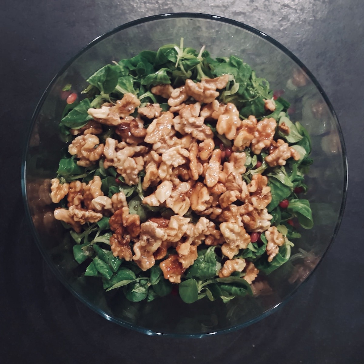Salat 250-300 Gramm Feldsalat 100-150 Gramm Granatapfelkerne (gibt es bei uns tiefgefroren in Bioqualität) Handvoll Walnüsse Honig Butter Dressing Olivenöl, Balsamico Essig, Salz, Pfeffer