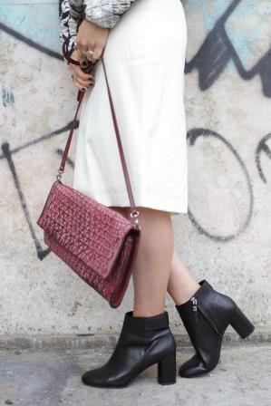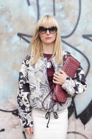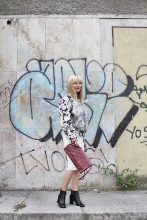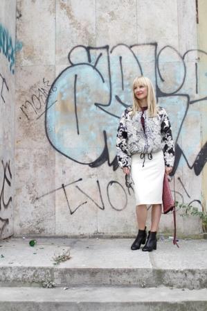 Ich kombiniere zu der Jacke von H&M Trend noch mehr H&M. Der Rock stammt aus einer echten Kooperation. Der cremefarbende Pencilskirt aus reiner Wolle ist von Madonna for H&M und also wirklich alt. T-Shirt, Kette: H&M Trend, Boots: Zara, Ringe: Cartier und Vintage, Tasche: numero 10, Brille: Oliver Peoples, Nagellack: Uslu Airlines.